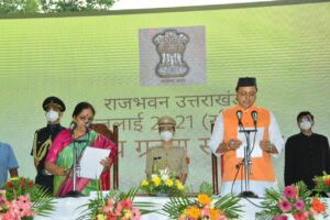 पुष्कर सिंह धामी को राज्यपाल बेबी रानी मौर्य ने दिलाई मुख्यमंत्री पद की शपथ, गयारह मंत्रियों ने ली शपथ